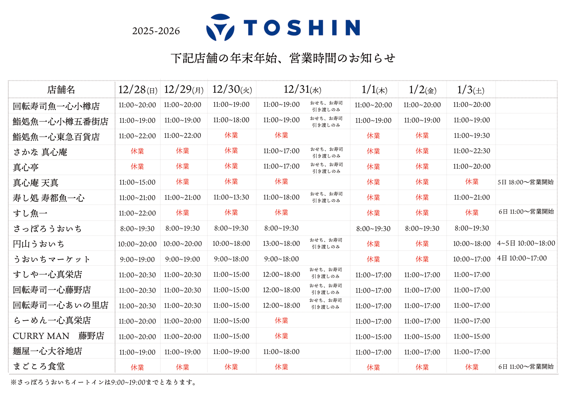 2025-2026 年末年始営業時間のお知らせ